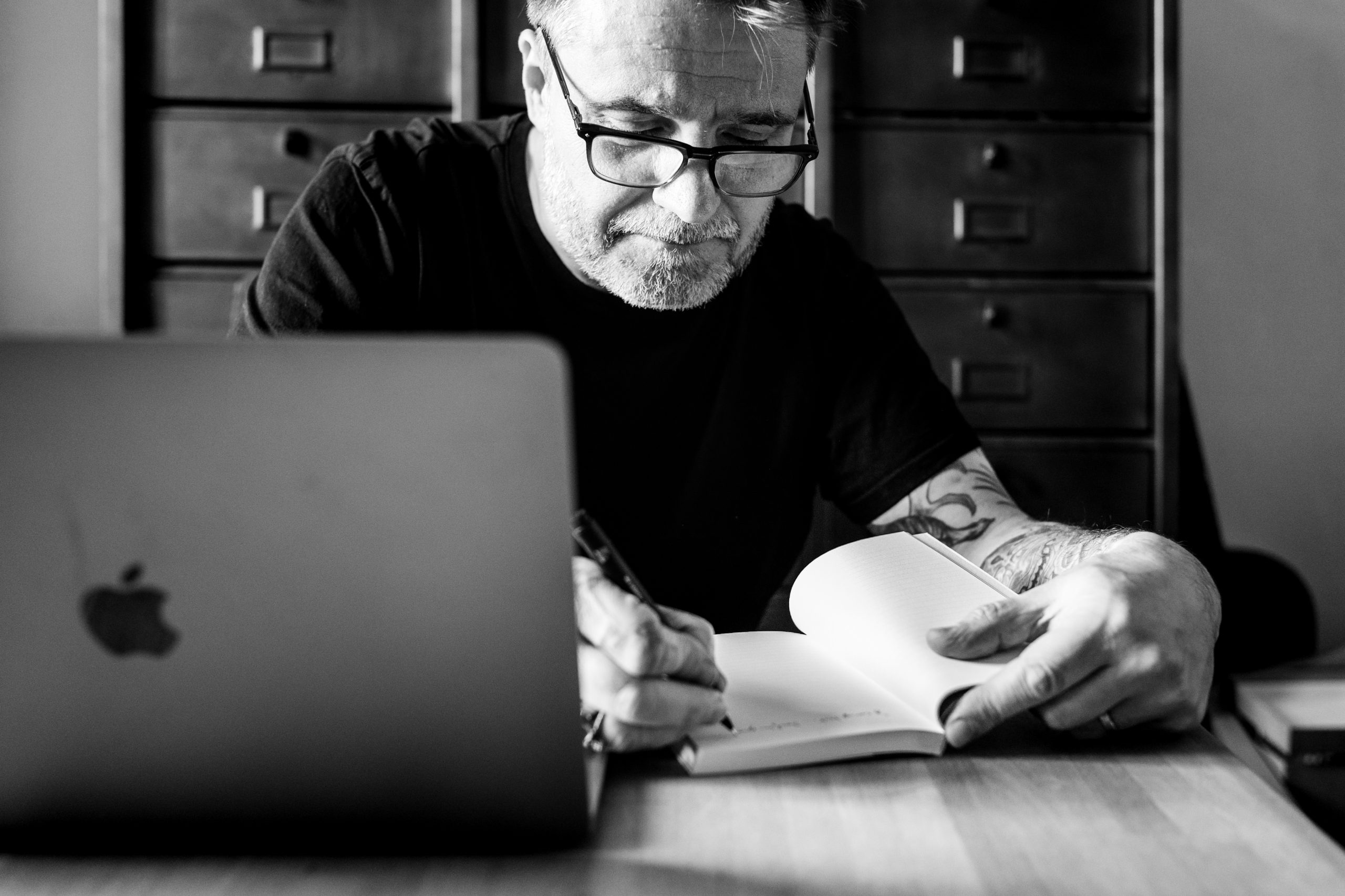 Comment une séance portrait peut révéler l’identité d’un entrepreneur ? Exemple avec un compagnon d’écriture à l’univers noir et blanc affirmé.