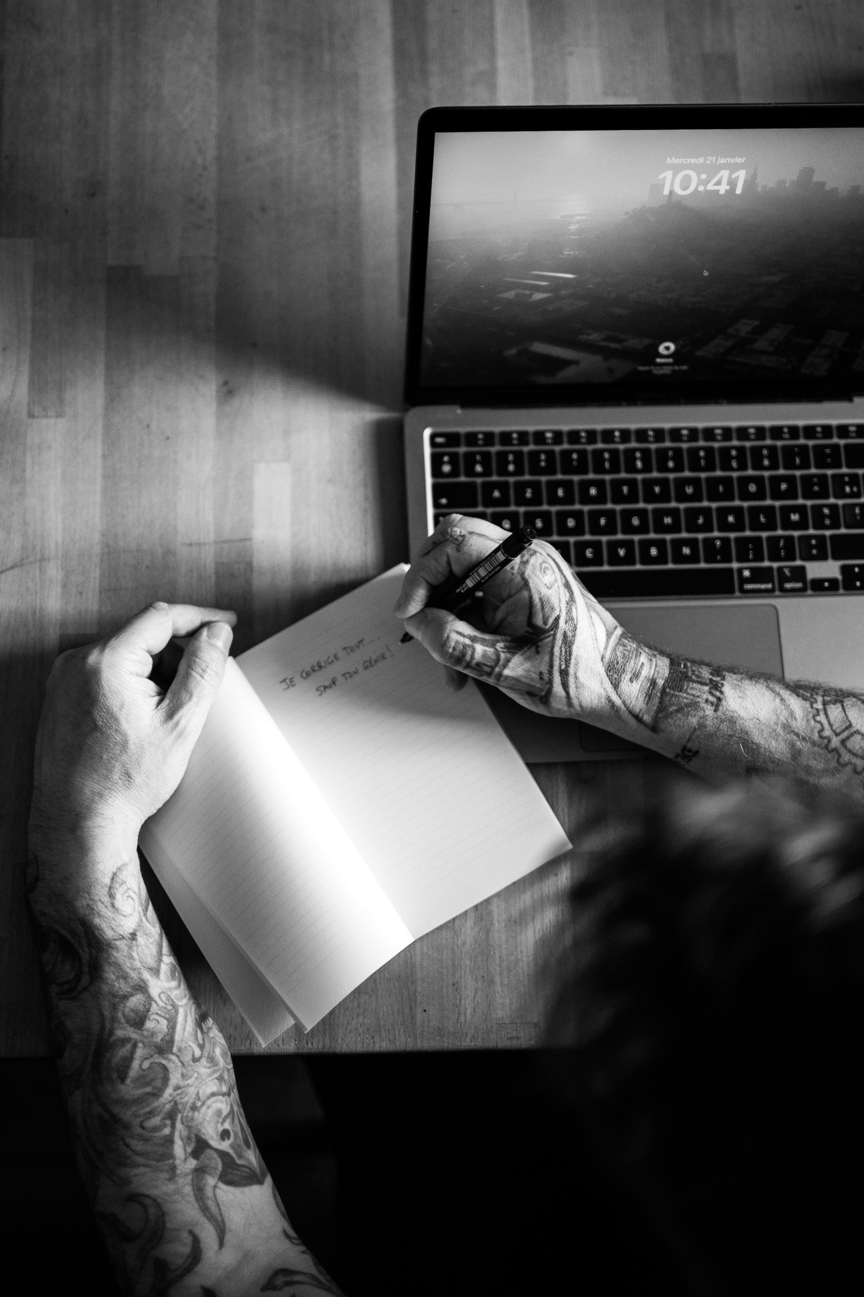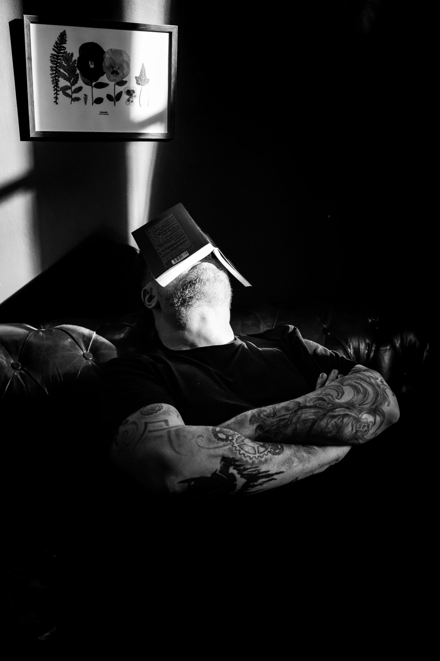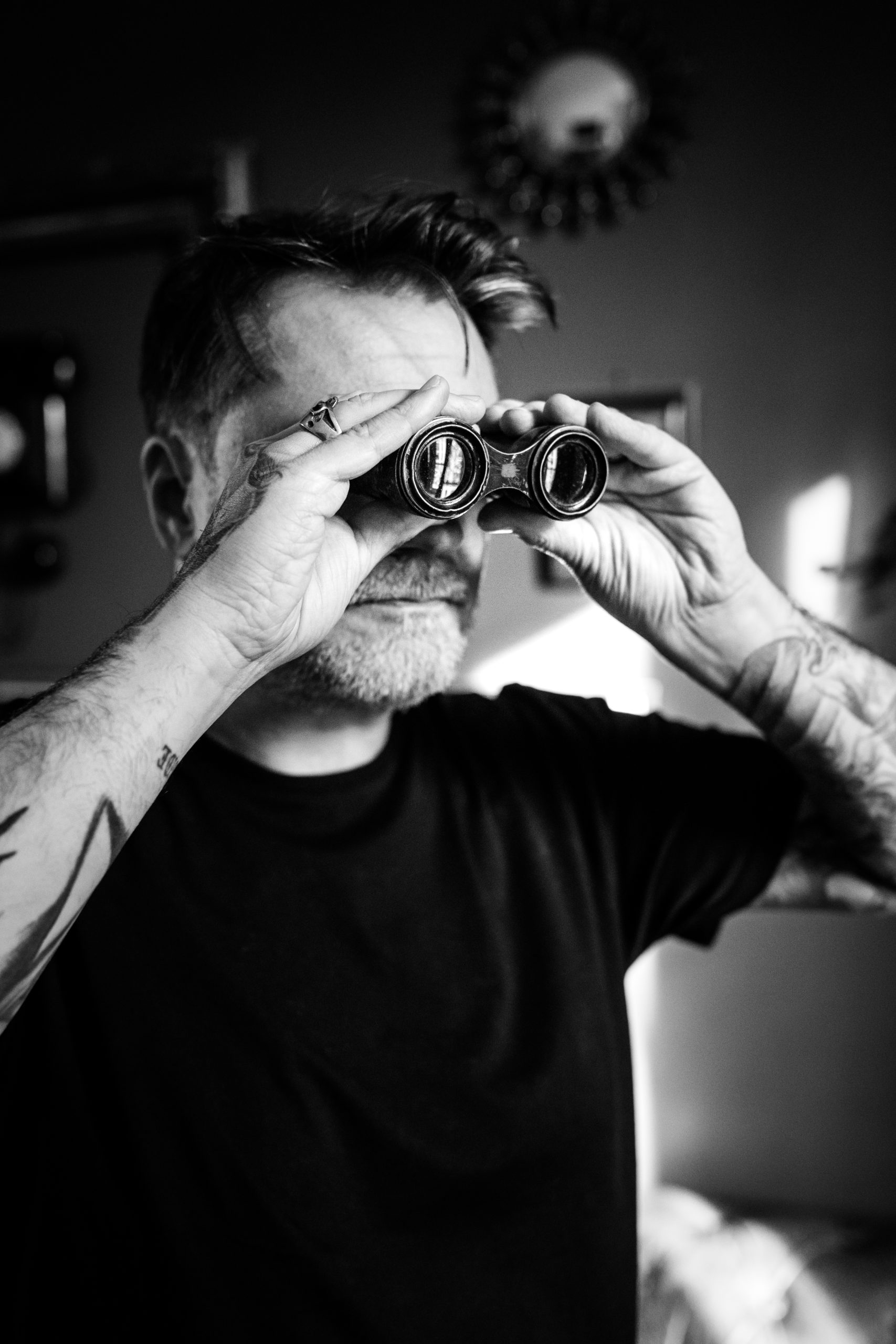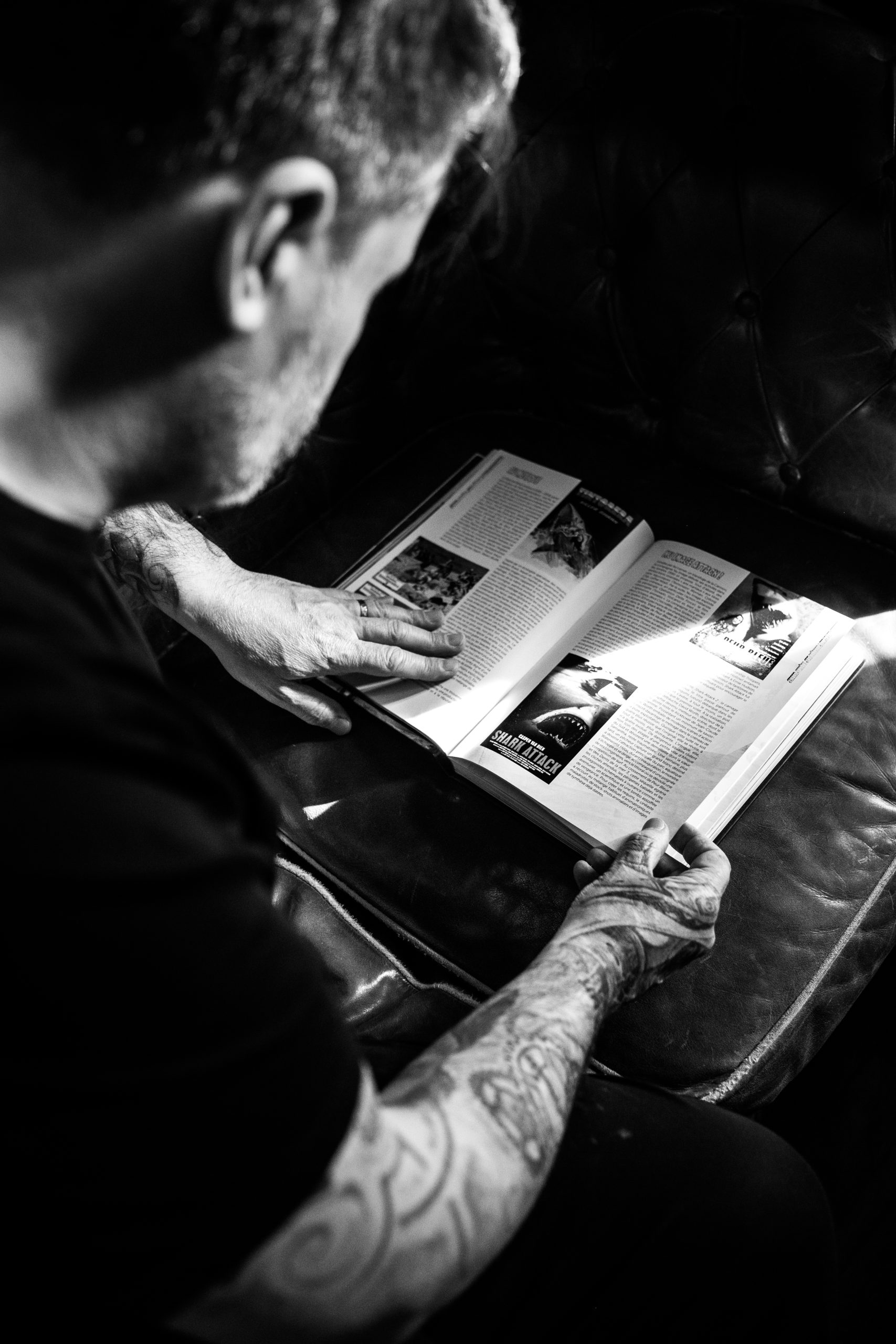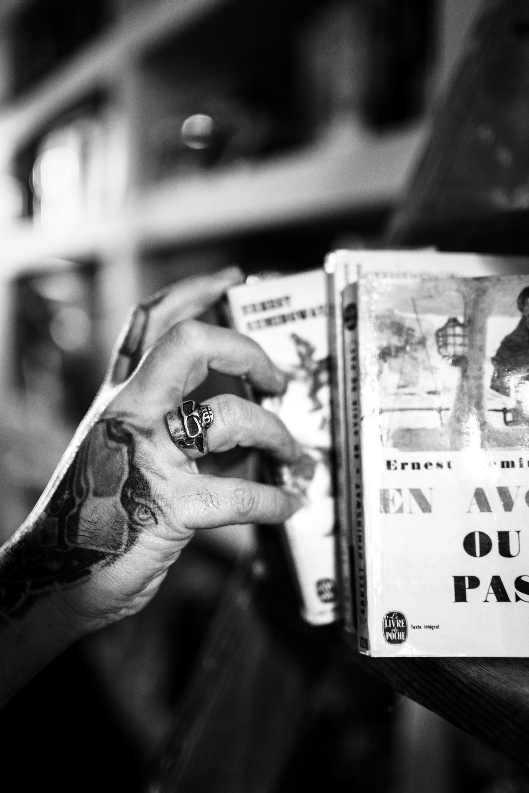 On est allé chercher des portraits en clair-obscur, des regards francs, des mains tatouées en gros plan, posées sur des livres, sur le bois brut de l’établi, sur la machine à écrire.